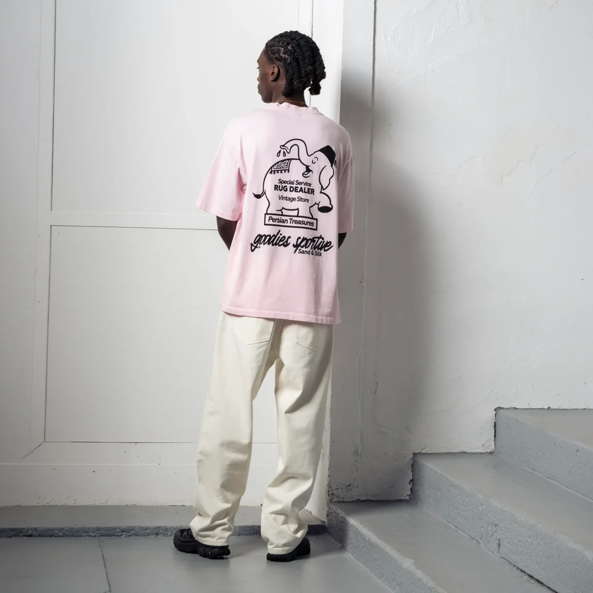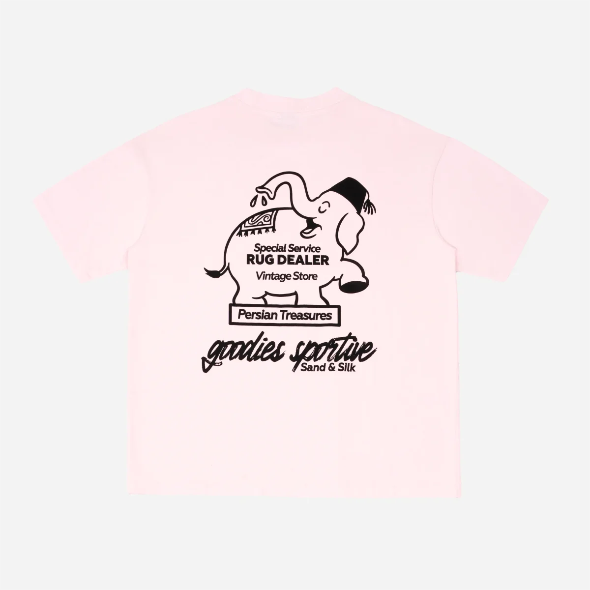 - Le Dos (Back Print) : Une illustration ludique en noir et blanc occupe le dos : un éléphant sympathique portant un fez et un tapis persan sur le dos, en train d’arroser une fleur. Le texte « Special Service RUG DEALER – Vintage Store » et la signature « Sand & Silk » (Sable et Soie) complètent ce visuel retro-cool.