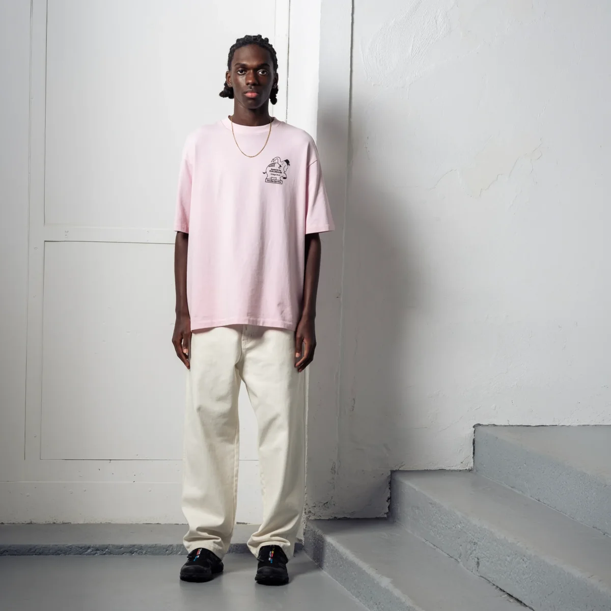 Pour un look estival frais, portez ce t-shirt rose avec un pantalon en toile écru (comme sur la photo) ou un short chino beige. Aux pieds, une paire de Salomon XT-4 White finalisera ce style décontracté mais pointu. Et découvrez tout le reste de la collection Goodies Sportive.