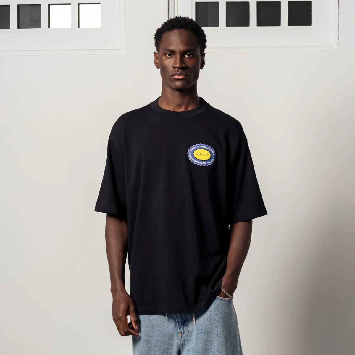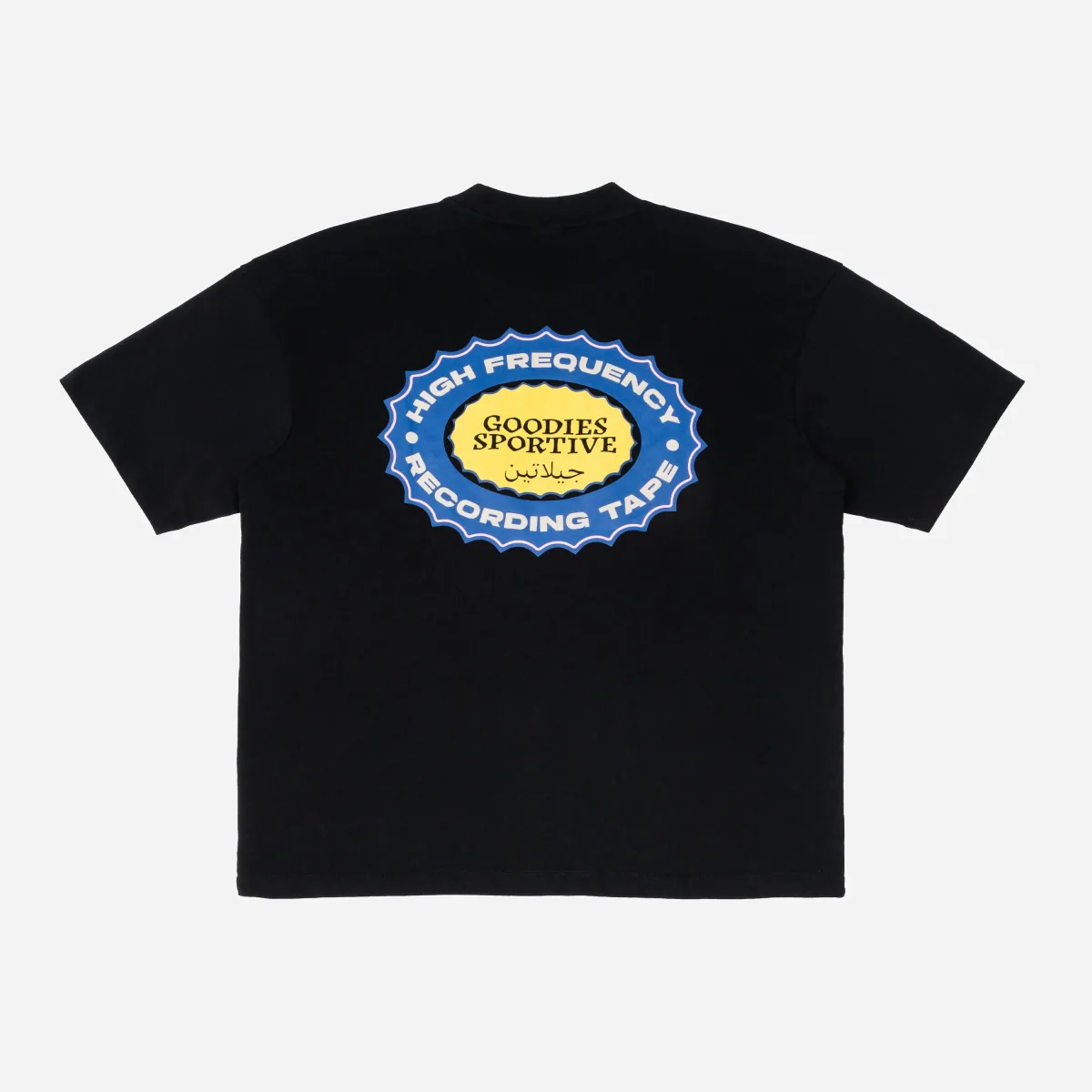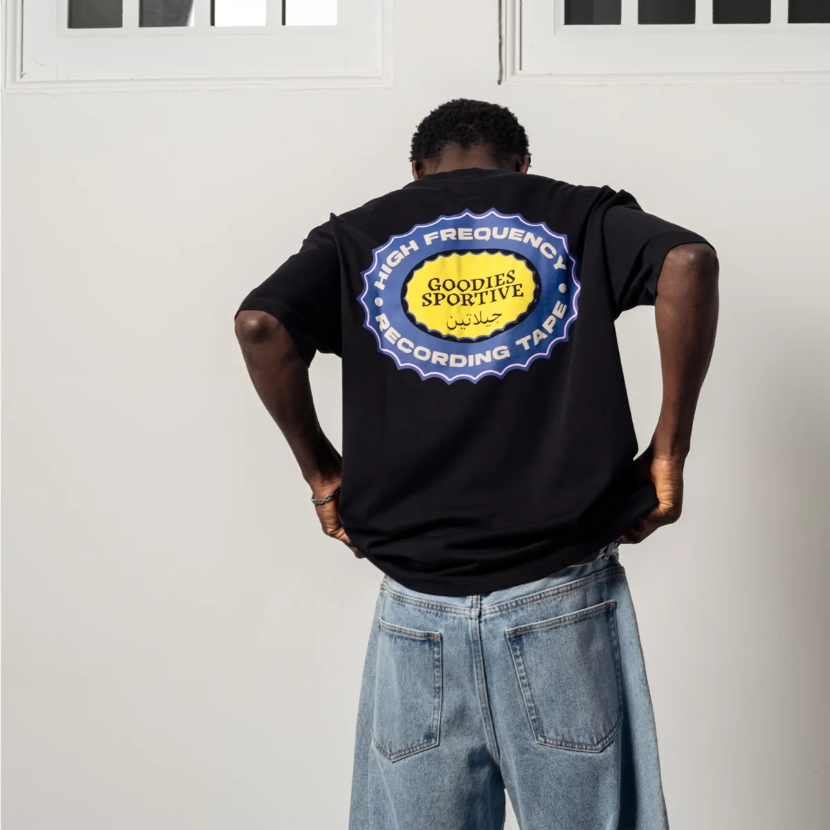 - Back Print « Hi-Fi » : Le dos arbore un grand macaron bleu et jaune au design industriel rétro. On y lit les mentions « HIGH FREQUENCY – RECORDING TAPE » entourant le logo Goodies Sportive, ainsi que des détails en calligraphie arabe qui ajoutent une touche internationale mystérieuse.