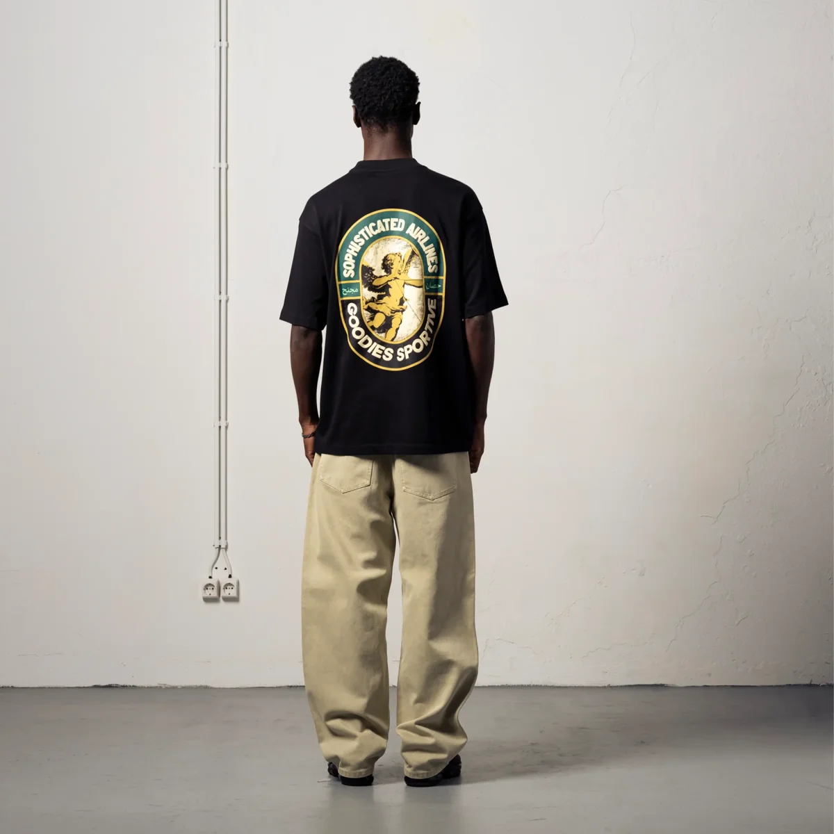 Le Goodies Sportive Sophisticated Airlines Tee est votre billet pour un style décontracté de première classe. Mêlant l’esthétique des compagnies aériennes rétro à une touche de romantisme classique (l’angelot), ce t-shirt noir est une pièce forte. Sa construction en coton ultra-lourd lui donne une allure structurée, loin des t-shirts basiques qui fatiguent après trois lavages.