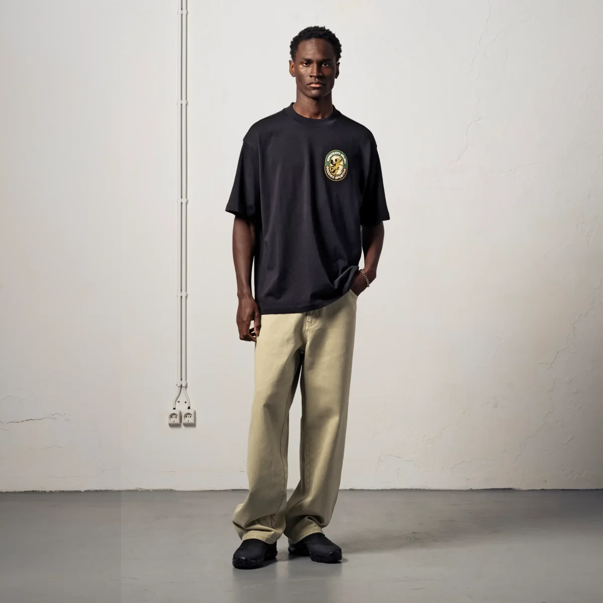 Le noir profond de ce t-shirt fait magnifiquement ressortir les couleurs du logo dorsal. Pour casser le côté sombre, associez-le à un pantalon clair (beige, crème ou denim délavé bleach) comme sur le lookbook. C’est le contraste parfait pour une tenue de mi-saison.