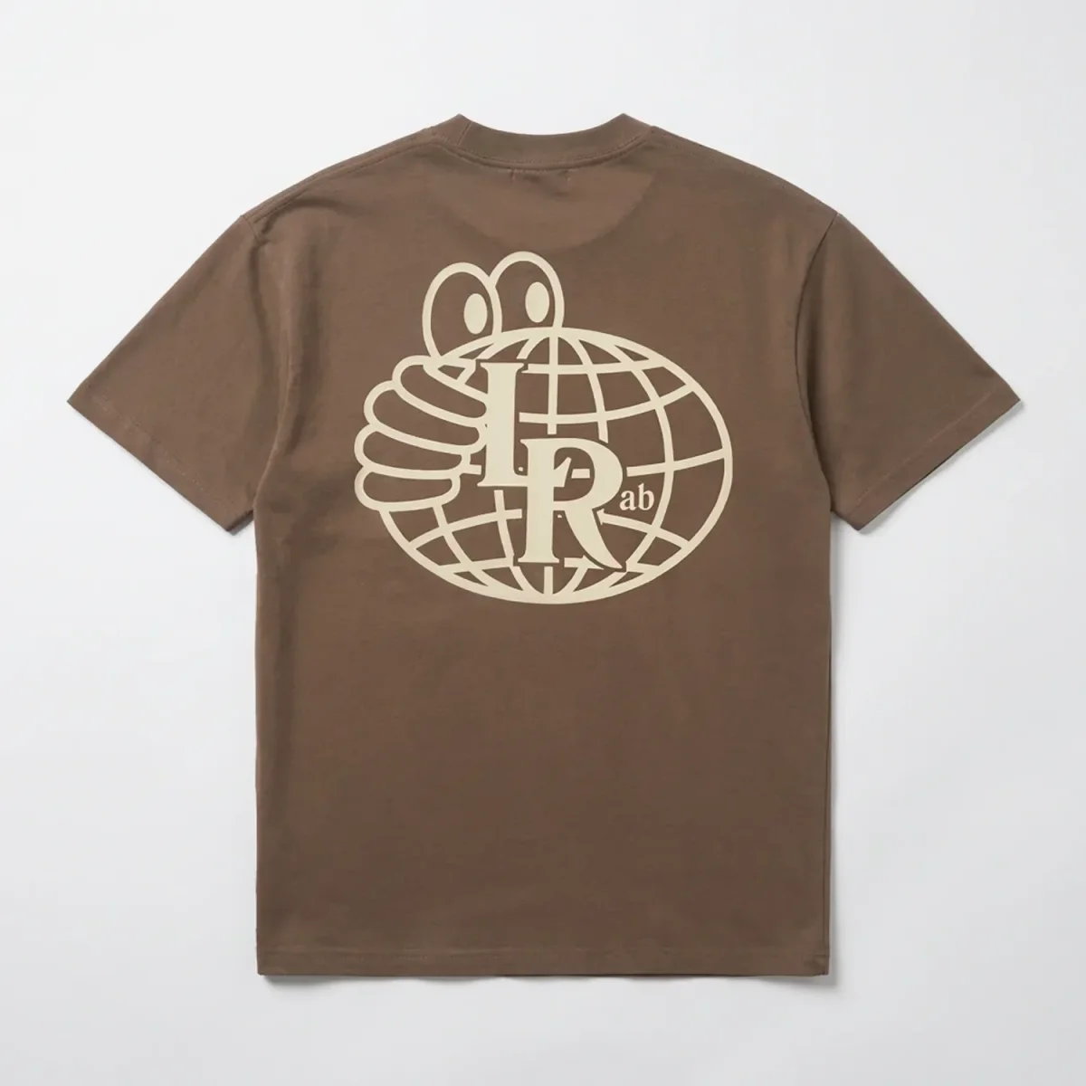 Le Graphique « Atlas » : C’est la pièce maîtresse du t-shirt. Le dos arbore une grande sérigraphie de couleur crème représentant les iconiques « yeux qui regardent » (peeping eyes) de la marque agrippant un globe terrestre, avec la typographie « LR ab » au centre.