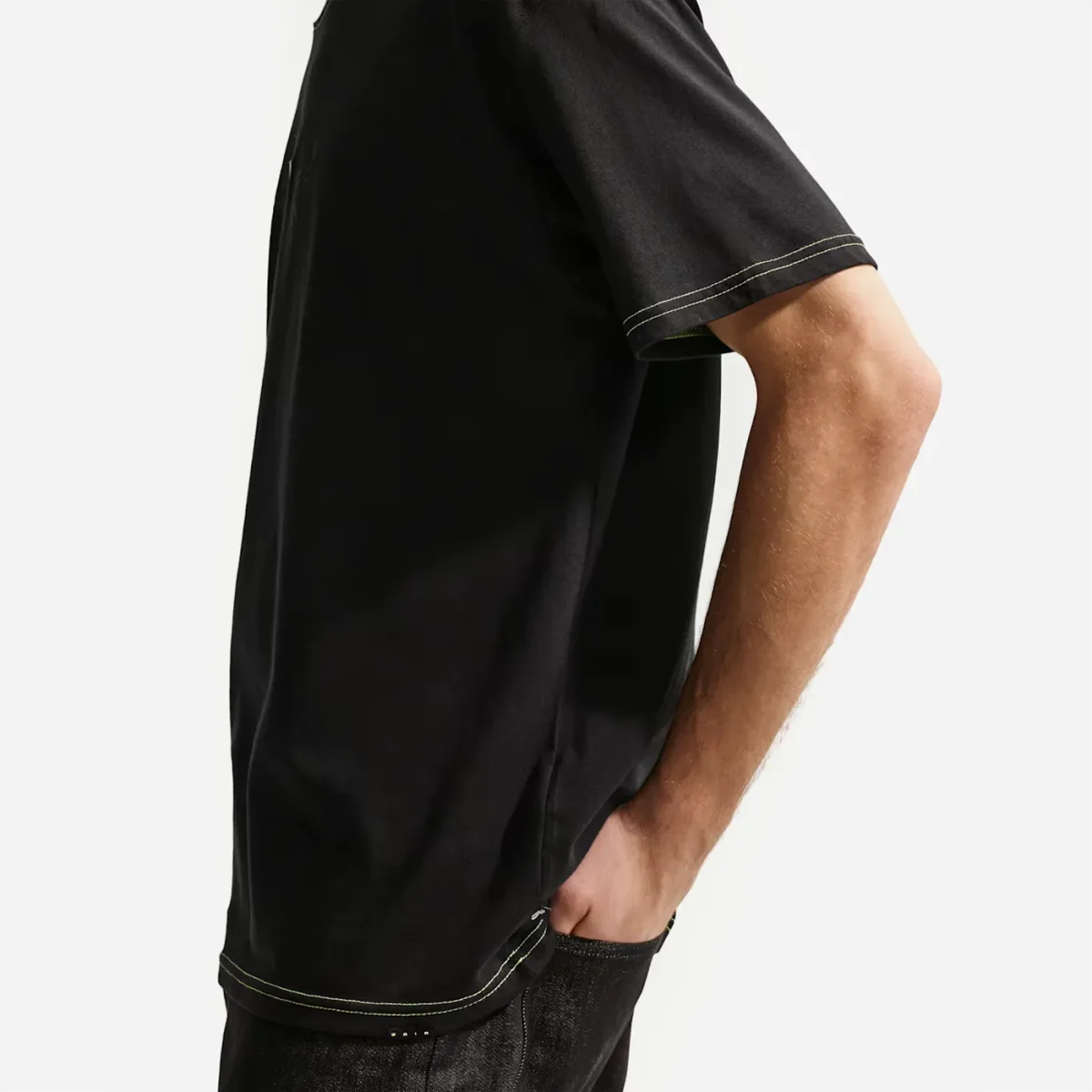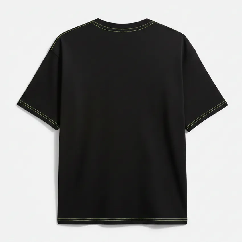 - Coutures Contrastées : Des fils de couleur vert lime/néon soulignent les épaules, le col et les ourlets. Ce détail « Contrast Stitch » apporte une structure visuelle forte et un look légèrement déconstruit très tendance.