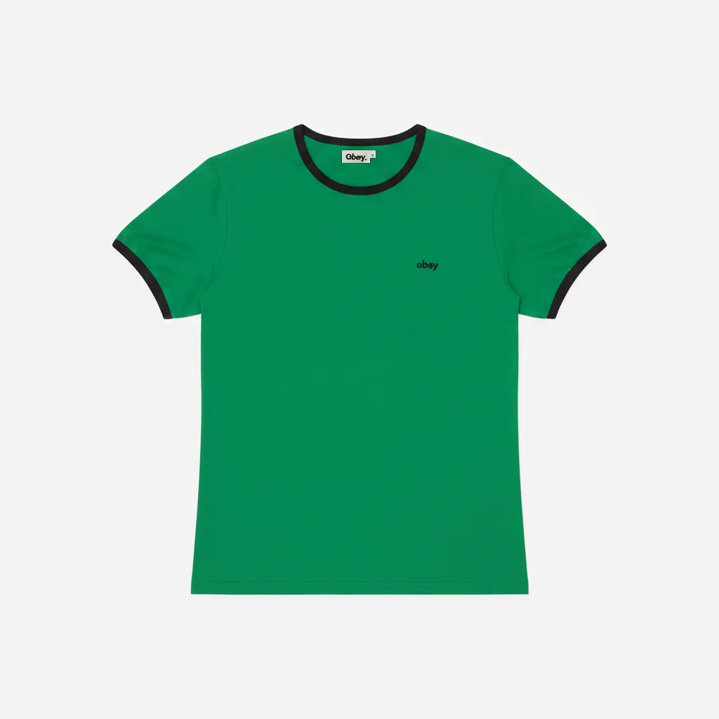 Détails Signatures : L’encolure et les ourlets des manches sont en bords-côtes contrastés (noirs sur fond vert). Le logo Obey est subtilement brodé sur la poitrine en lettres minuscules.