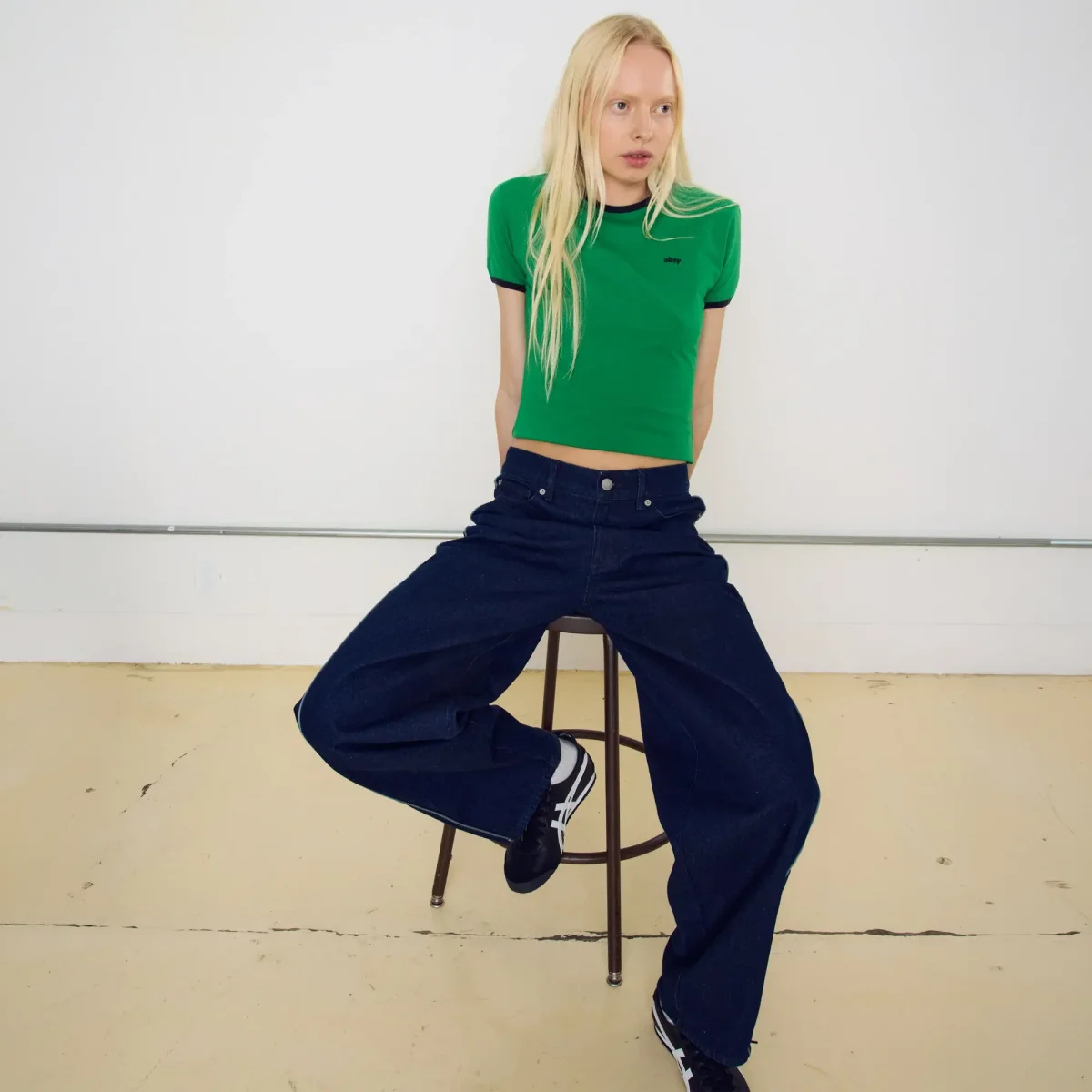 La règle d’or du streetwear moderne est l’équilibre des volumes. Puisque ce t-shirt a une coupe moulante (fitted), associez-le avec un pantalon très ample, comme le jean Obey Leah III Baggy Denim. Complétez avec des sneakers fines pour un look années 90 / Y2K redoutable.