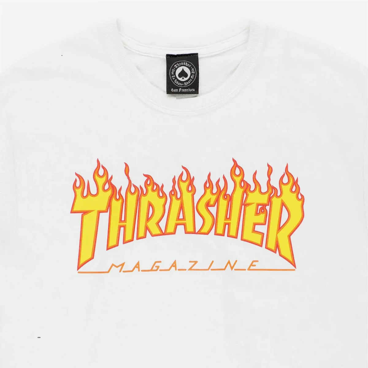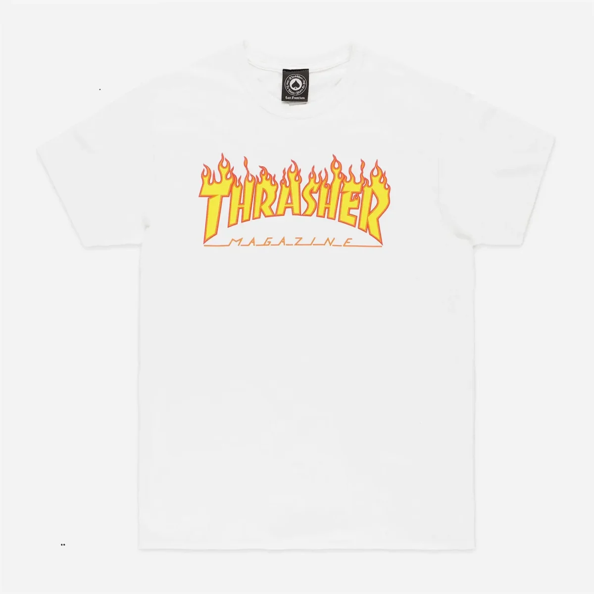 T-shirt Thrasher blanc avec logo flammes imprimé sur le torse.