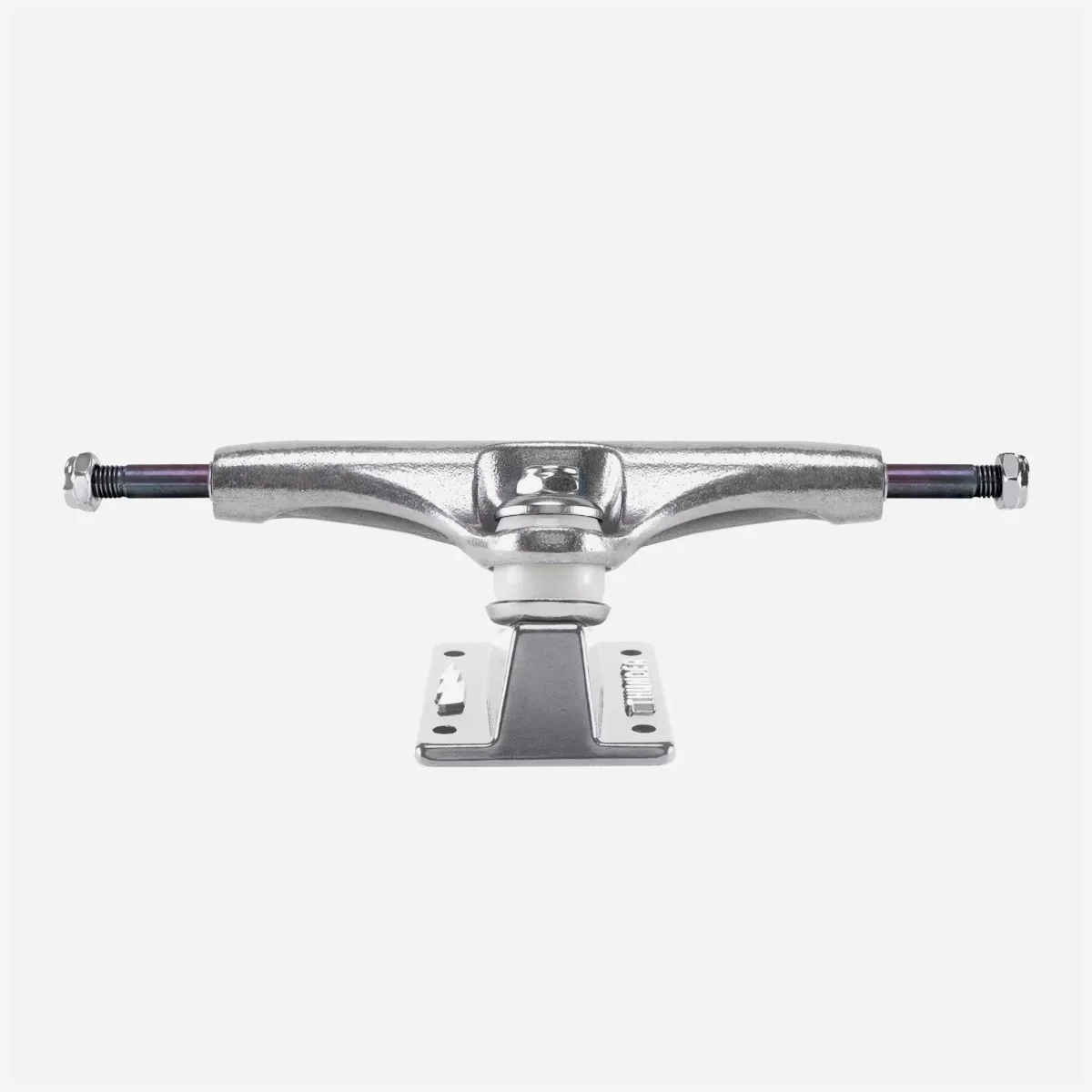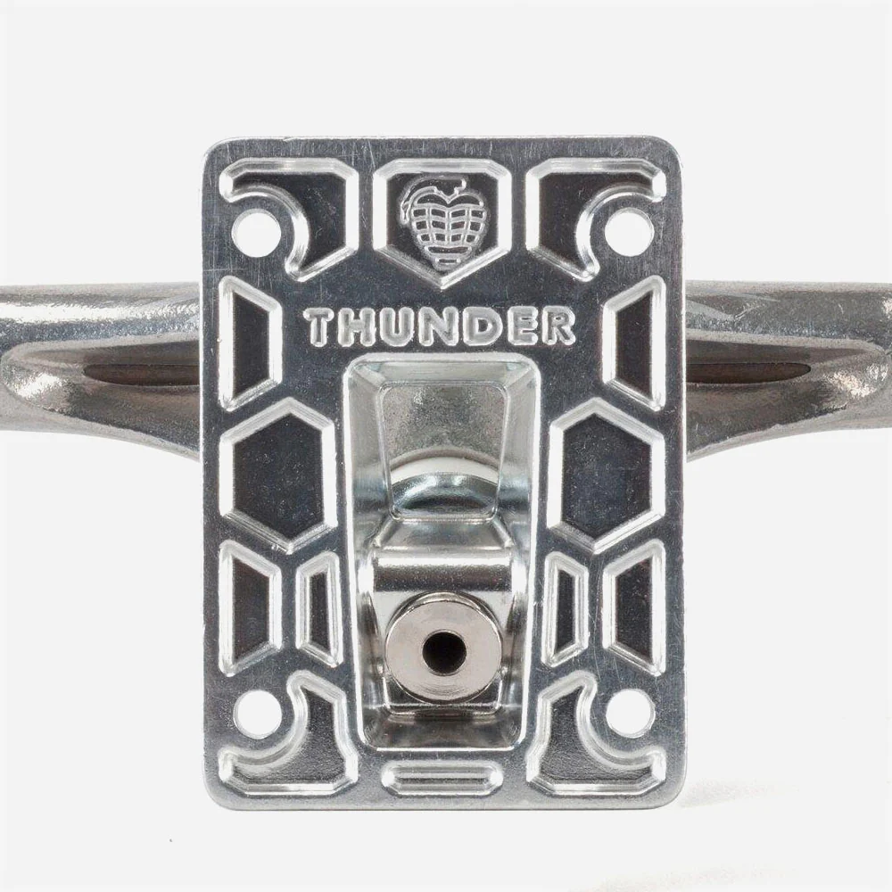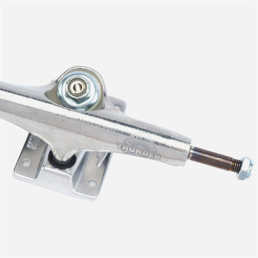 Paire de trucks Thunder Titanium Lights 3, des trucks de skateboard haut de gamme conçus pour résister à toutes les sollicitations. Les pivots creux, les embases forgées et les axes en titane permettent de réduire le poids sans perte de résistance ni de durabilité. Pour un flick rapide, un contrôle et une résistance optimaux, ne cherchez pas plus loin que les Thunder Titanium Lights High.