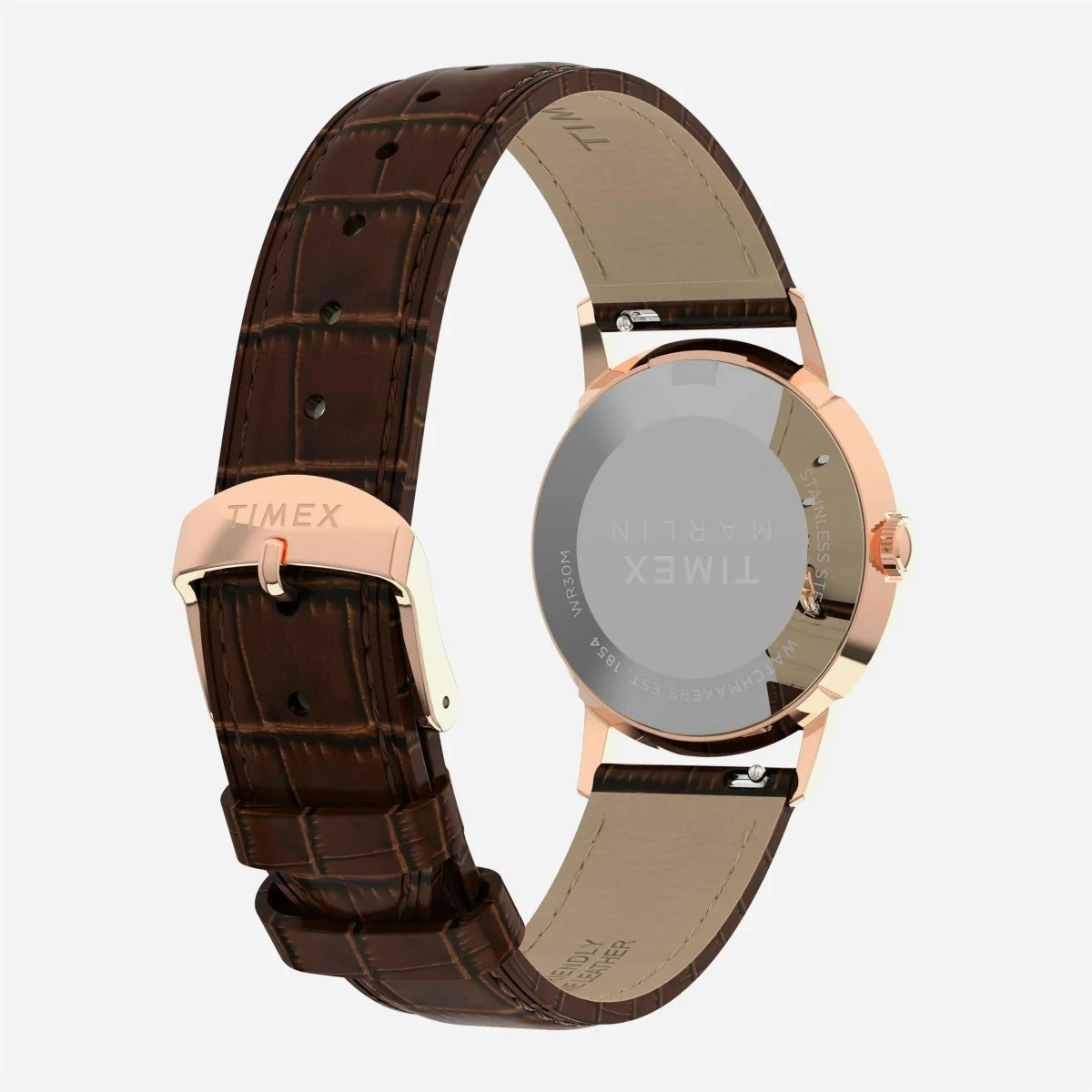 Le style épuré des années 60 rencontre le cuir grainé crocodile sur une icône du milieu du siècle. Logée dans un boîtier en acier inoxydable or rose poli de 34 mm surmonté d’un verre acrylique bombé de style vintage, cette élégante version actualisée de la Marlin est animée par un mouvement à quartz fiable et dispose d’un cadran argenté avec des index métalliques polis et des aiguilles luminescentes. Son charme rétro est rehaussé par un bracelet en cuir naturel grain crocodile brun, issu de sources éthiques certifiées par le Leather Working Group (LWG) et équipé de barrettes à ressort à dégagement rapide pour un changement facile du bracelet sans outils.