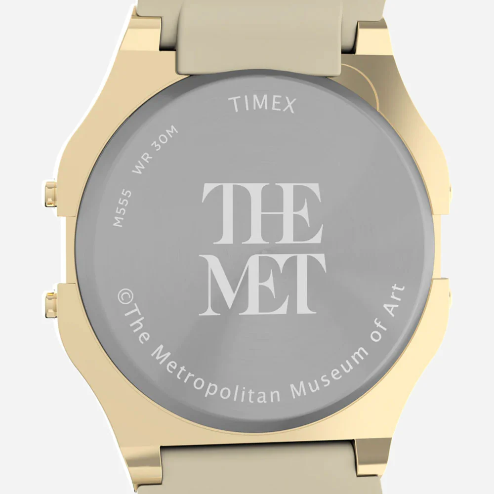Cette version exclusive de la T80 revêt la vague au large de Kanagawa, également connue sous le nom de La grande vague, une gravure sur bois créée vers 1830 par Katsushika Hokusai. Cette célèbre estampe de la série bien connue des Trente-six vues du mont Fuji d’Hokusai représente une vague colossale encadrant le mont Fuji, comparativement petit, à l’arrière-plan ; un hommage à l’impressionnante puissance de la nature. L’œuvre d’art se poursuit sur le bracelet en résine, tandis que le boîtier de couleur or complète parfaitement les vagues bleues qui ornent l’objectif. Dotée d’une fonction chronographe, d’une alarme quotidienne, d’un cristal acrylique, d’un rétroéclairage INDIGLO® et d’un affichage de la date, cette montre magnifiquement détaillée transforme un chef-d’œuvre de la collection Met en une œuvre d’art intemporelle.