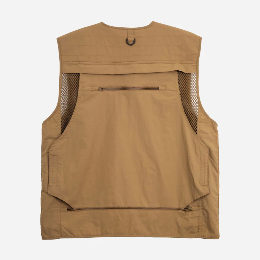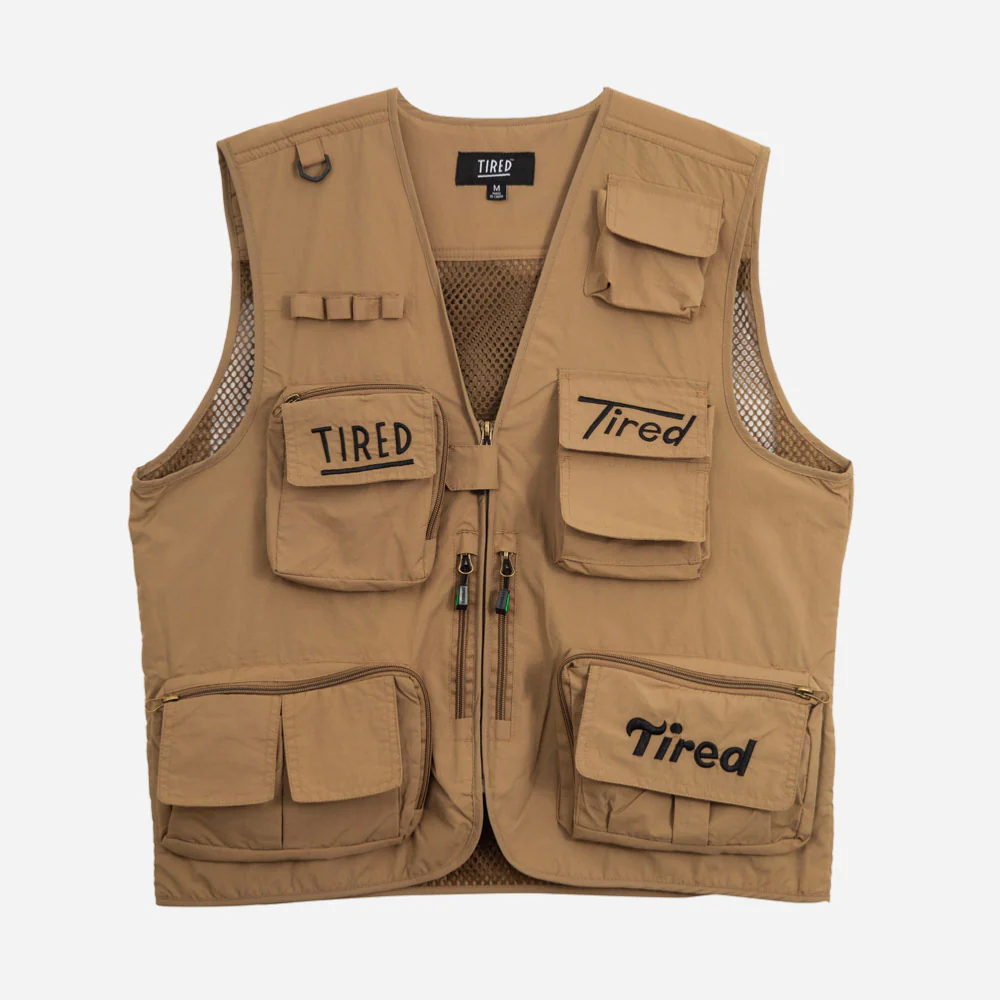 Gilet utiltaire de peche en mesh avec de nombreuses poches et logos TIRED sur la poitrine.