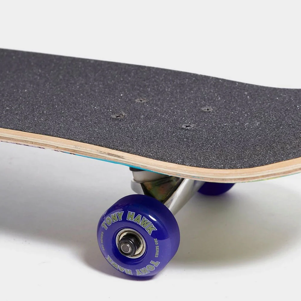 Skateboard complet Tony Hawk. Prêt à l’emploi avec Trucks, roues, roulements, grip et visserie. Shape classique.