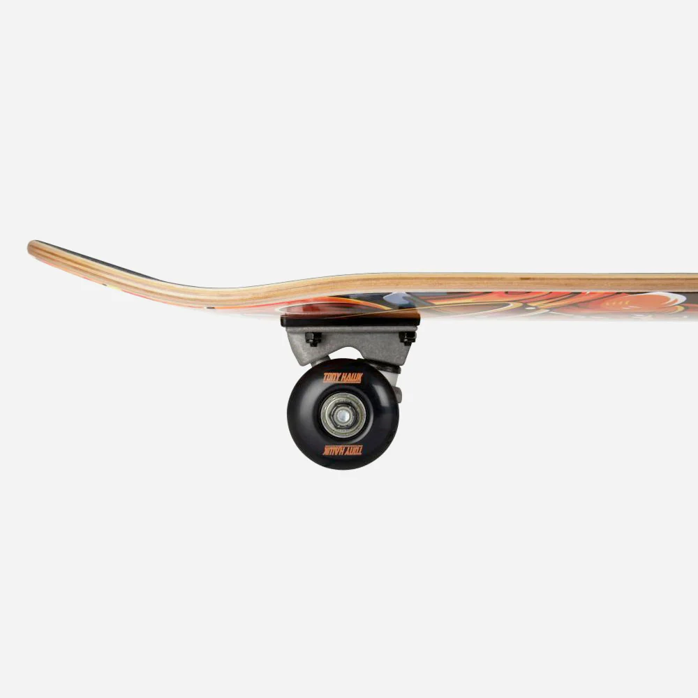 Planche de skateboard complète Tony Hawk. Prête à l’emploi avec Trucks, roues, roulements, grip et visserie. Shape classique.