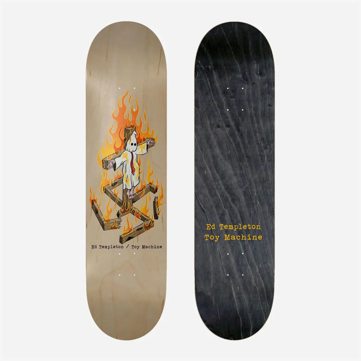 Planche de skateboard Toy Machine avec le désormais iconique visuel Charred Cross d’Ed Templeton, fabriquée en bois d’érable 7-plis et résine époxy.