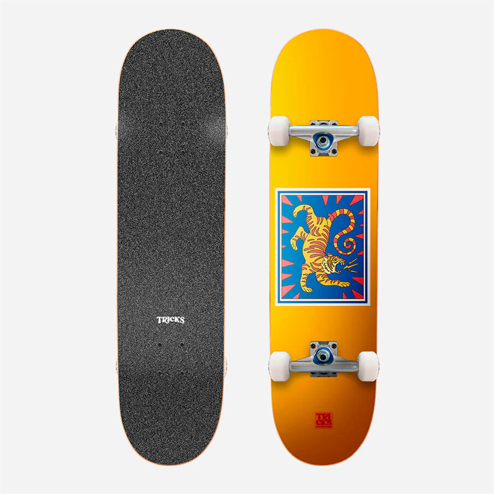 Skateboard complet Tricks pensé pour les enfants à partir de 11 ans ou mesurant 150 cm et plus. Il est conçu pour aider à débuter , d’acompagner dans la progression et de fpasser au niveau supérieur. Prête à l’emploi avec Trucks, roues, roulements, grip et visserie. Shape classique.