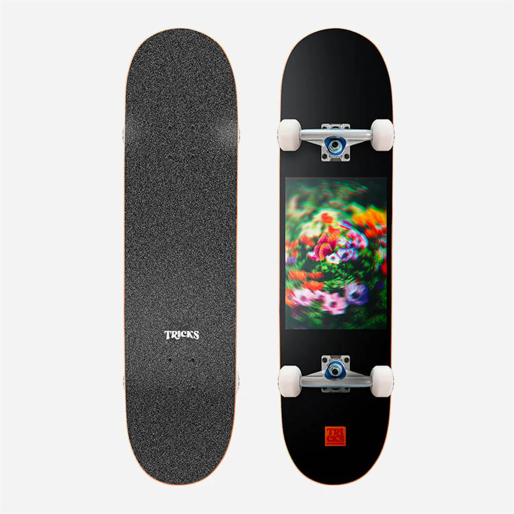Planche de skateboard complète Tricks. Prête à l’emploi avec Trucks, roues, roulements, grip et visserie. Shape classique. Livrée entièrement montée.