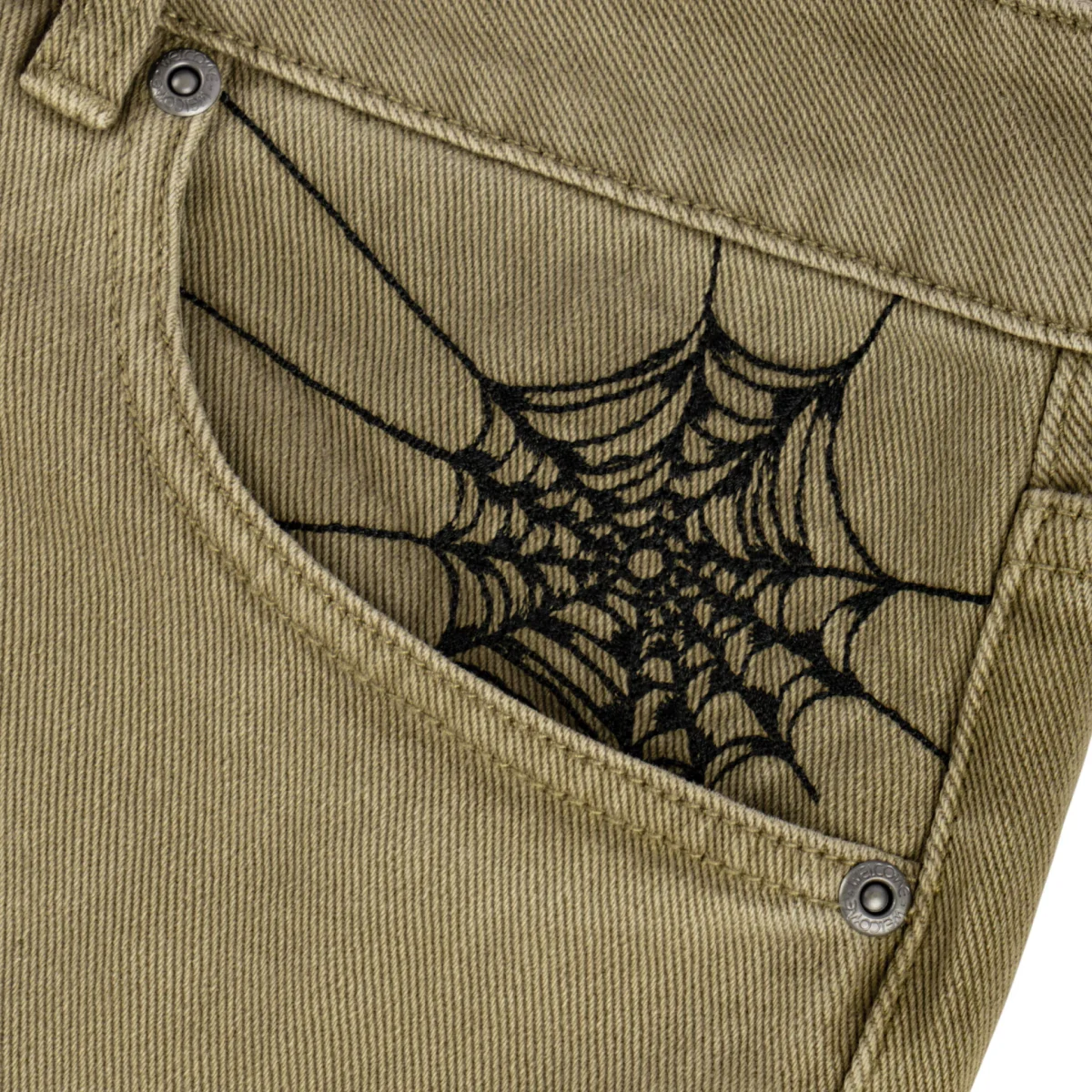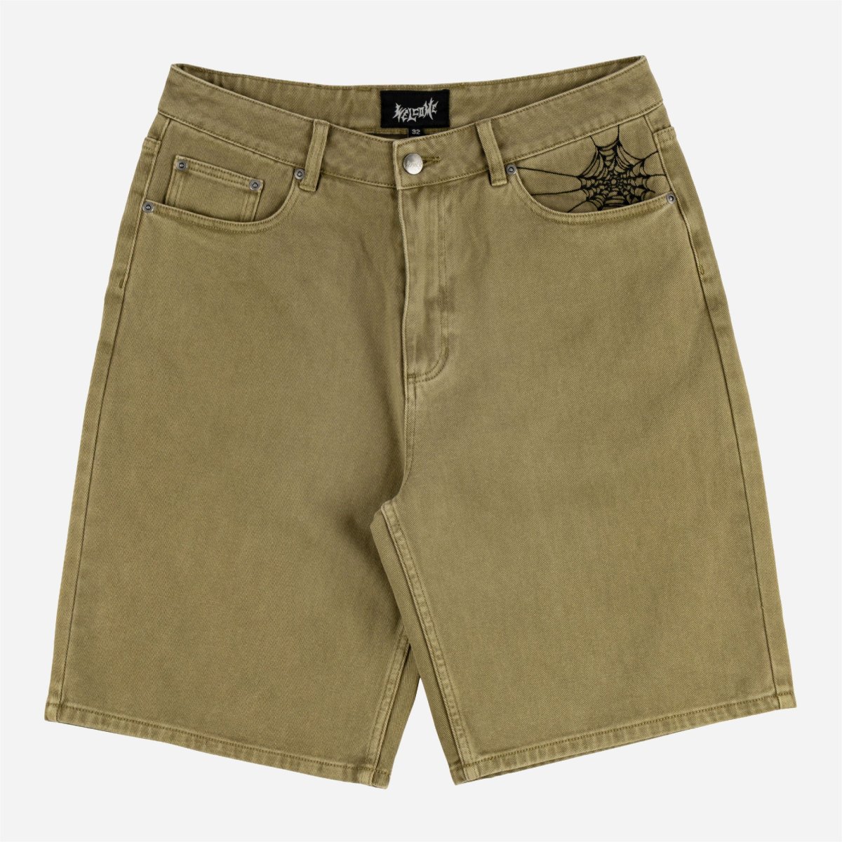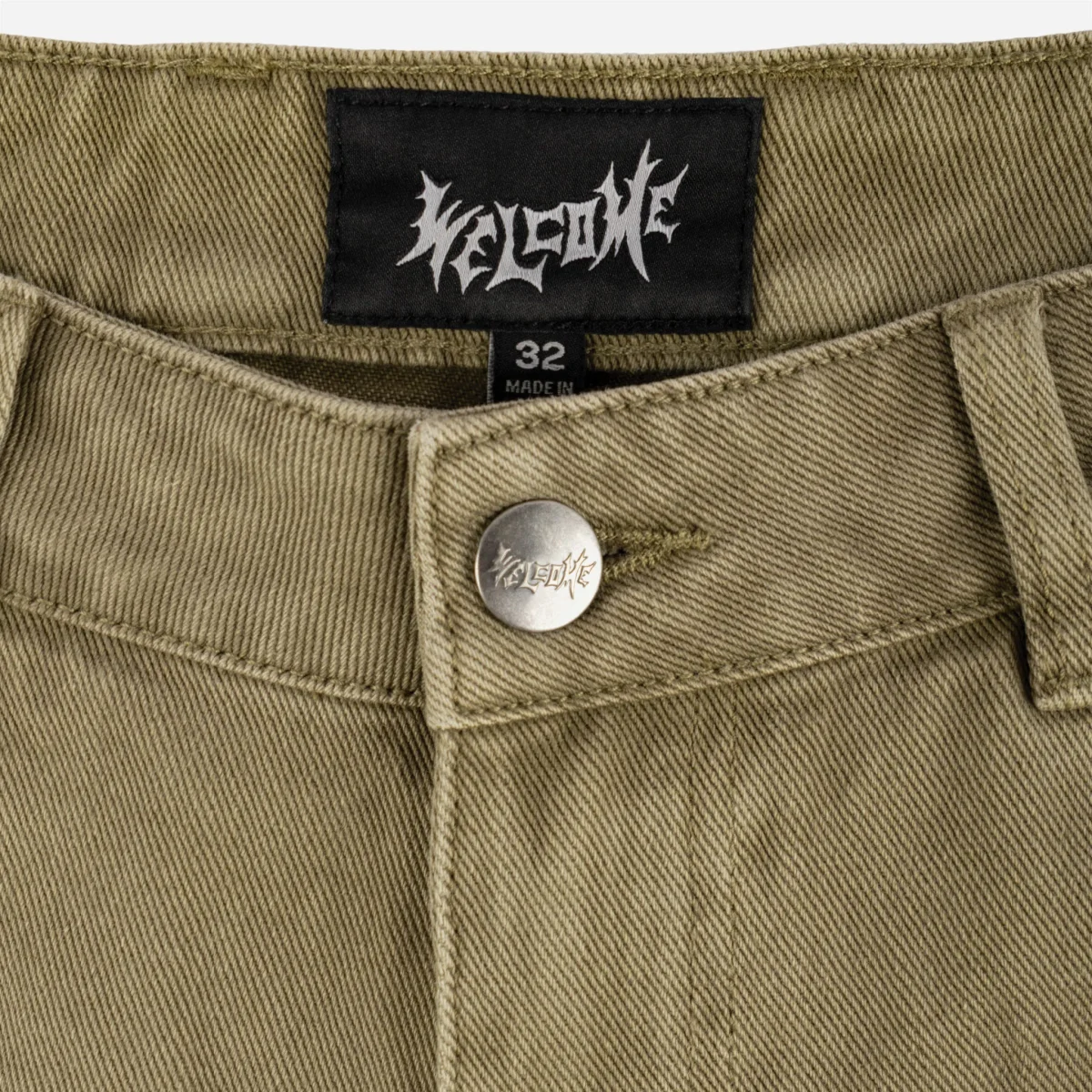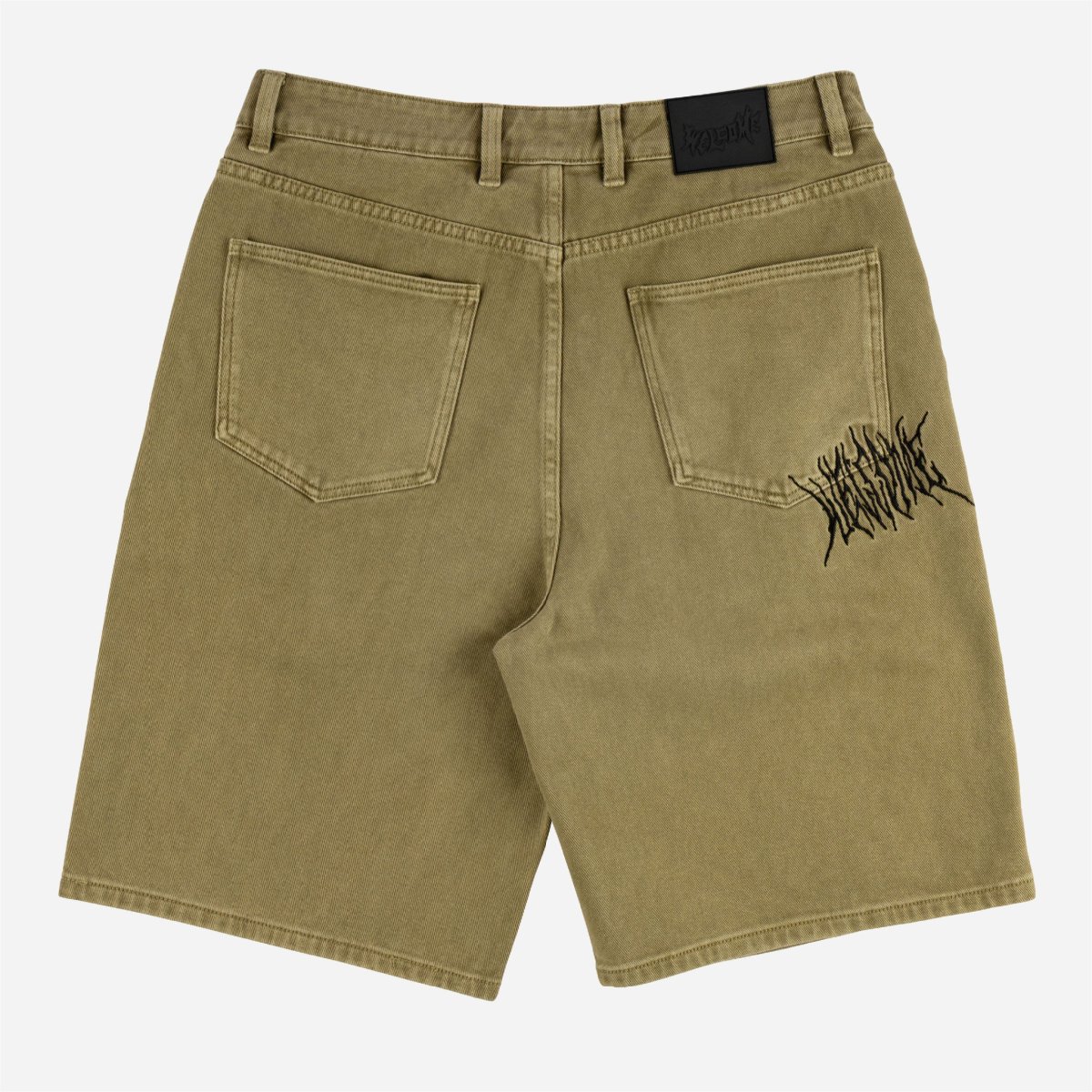 Short Welcome fabriqué toile de jean 14 onces. Coupe 5 poches, longue et ample arrivant au-dessous du genou. Bouton en nickel à la taille, rivets inversés avec logo en nickel sur les poches avant, broderie du logo Welcome sur le bas de la poche arrière droite, broderie en toile d’araignée sur la poche avant gauche et écusson en PVC du logo à la taille arrière droite.