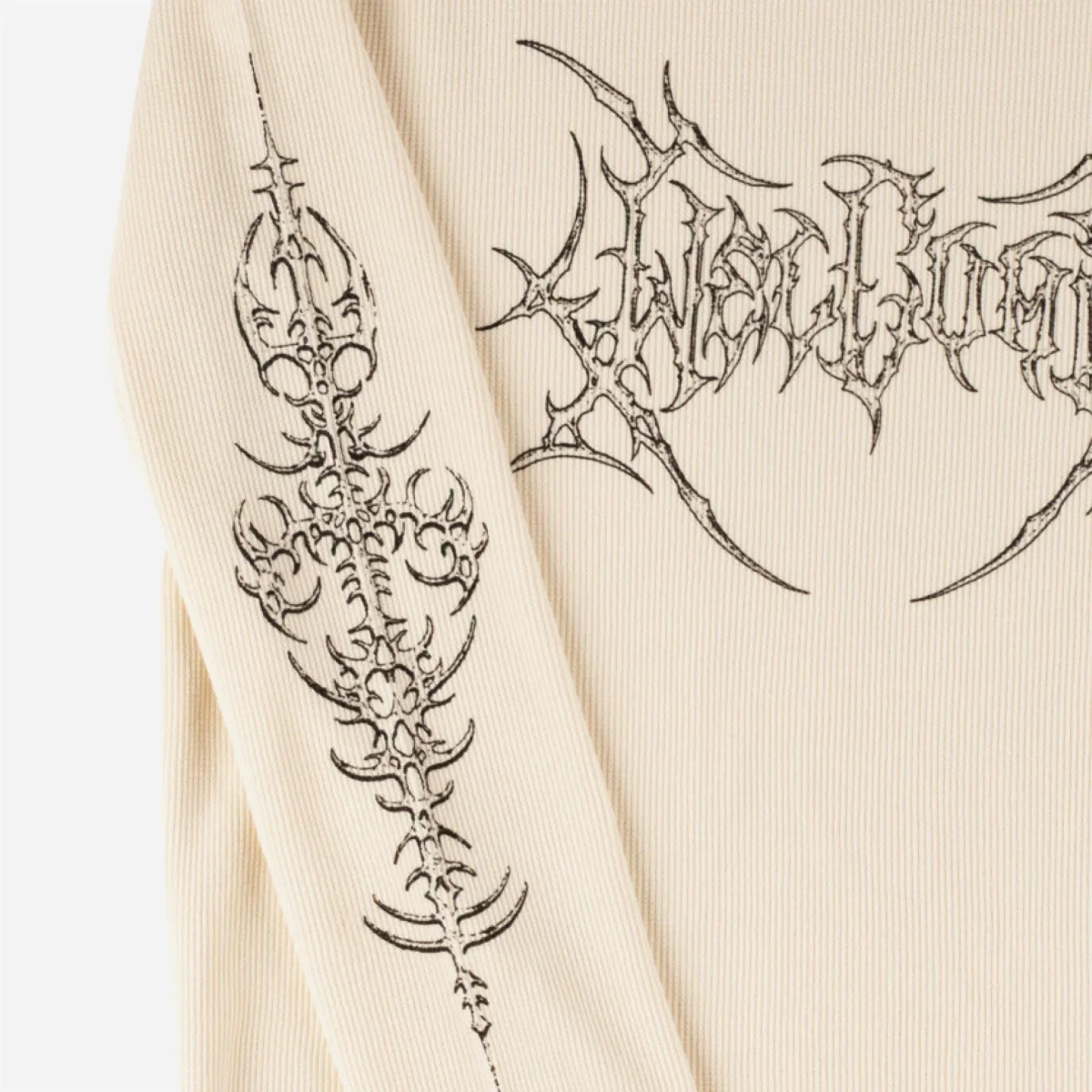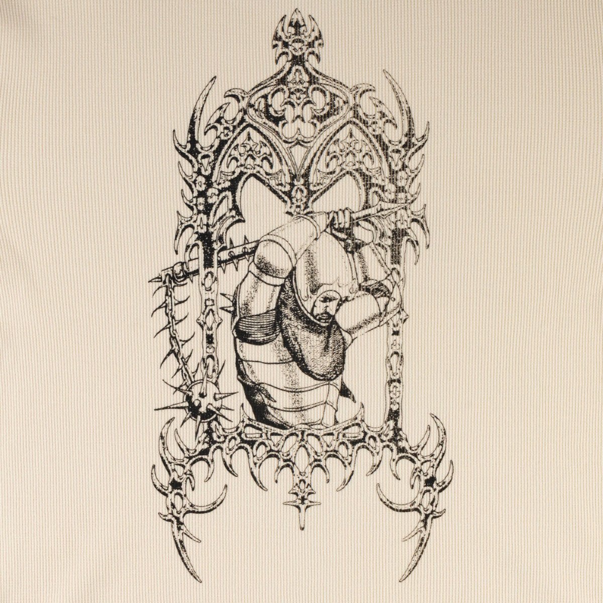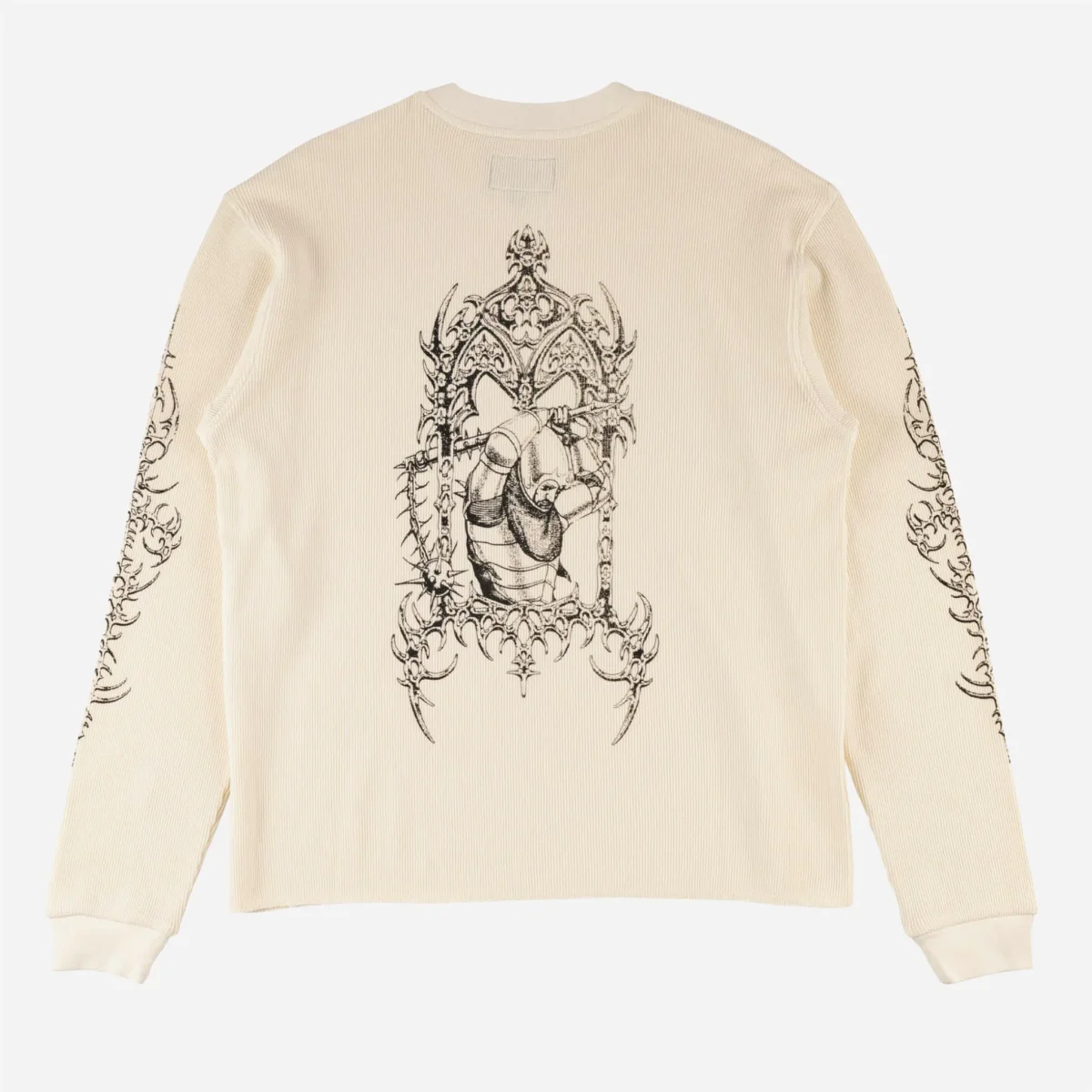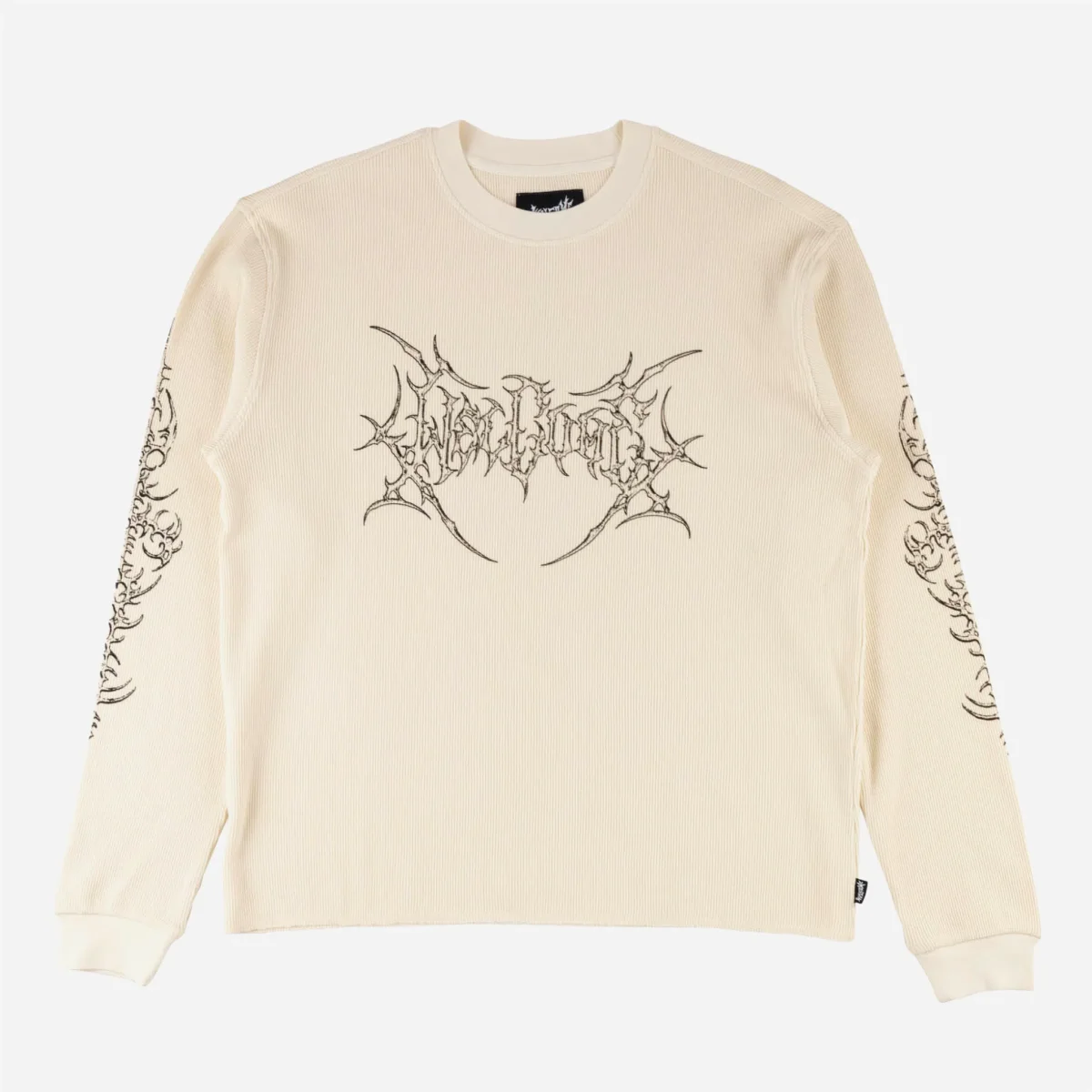 Le Welcome Gallant Pigment-Dyed Thermal allie tradition et modernité avec une inspiration médiévale revisitée. Confectionné en coton texturé à mailles thermiques, ce long sleeve assure chaleur et confort tout en affichant un style unique. Le logo metal sur la poitrine, les ornements graphiques sur les manches et l’illustration d’un chevalier en action sur le dos, entourée d’une architecture gothique, confèrent à cette pièce un caractère artistique affirmé. Idéal pour ceux qui recherchent une touche streetwear distinctive mêlée à un art détaillé.