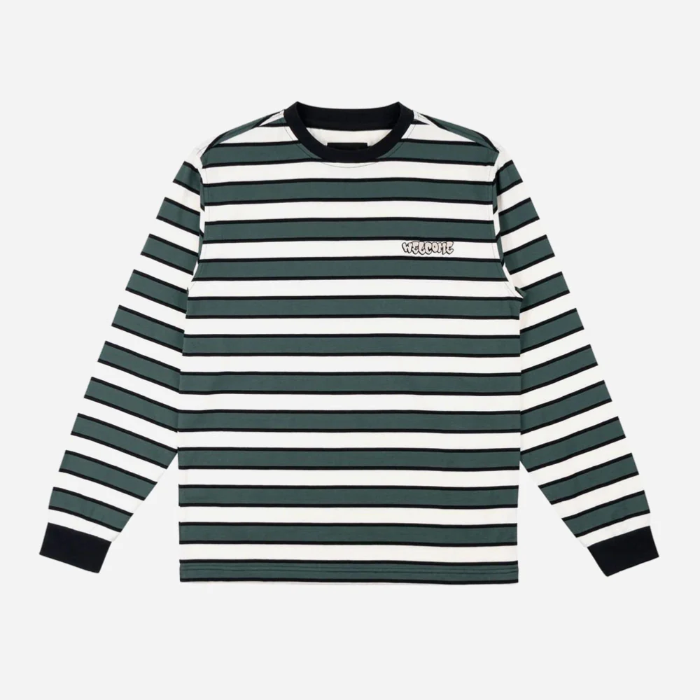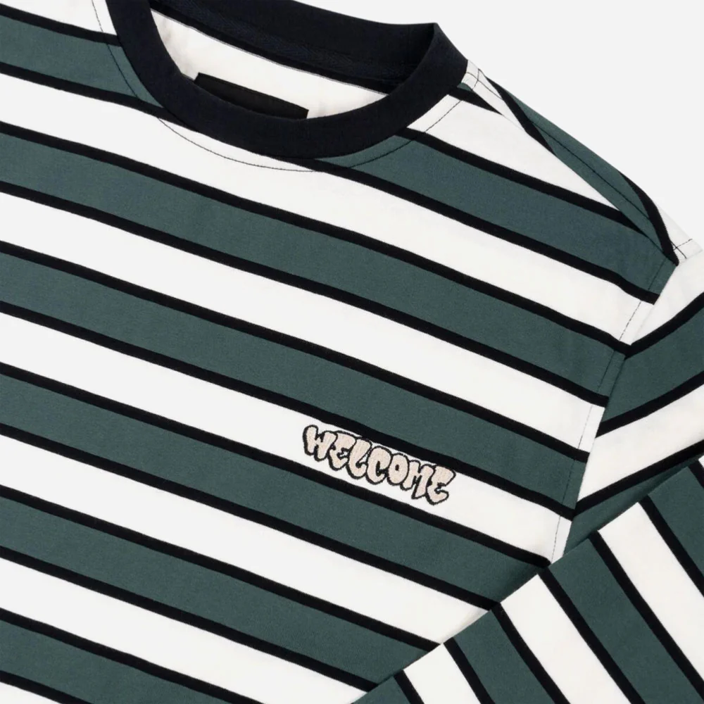 WELCOME SKATEBOARDS – COOPER STRIPED YARN-DYED L/S KNIT – SpruceT-shirt Welcome à manches longues et rayures, fabriqué en coton épais, logo Welcome « bubble » brodé sur la poitrine.