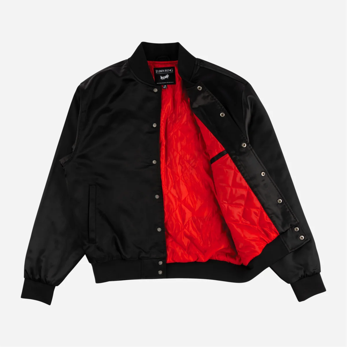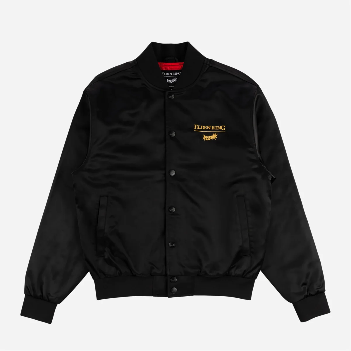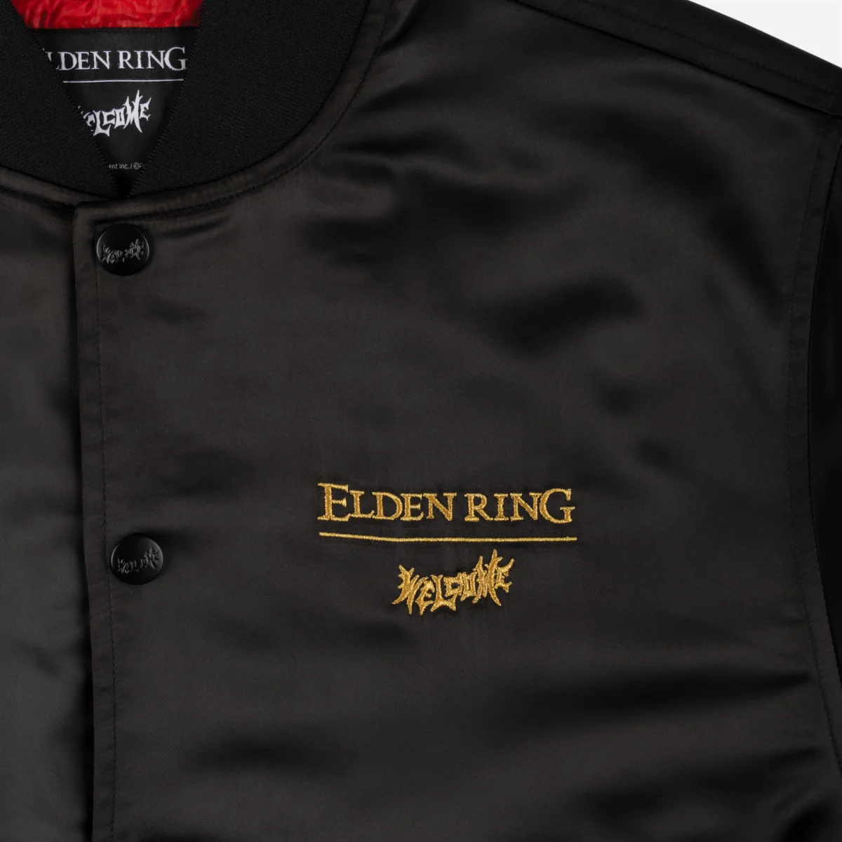 Veste Welcome réalisé en collaboration officielle avec Elden Ring, FromSoftware et Bandai Namco. Coupe ample sur une base de Varsity jacket, fabriquée en satin noir avec doublure en satin matelassé rouge. Logo de la collab brodé la poitrine gauche et large broderie à l’arrière faisant référence à l’emblématique personnage de Malenia, épée de Miquella.
